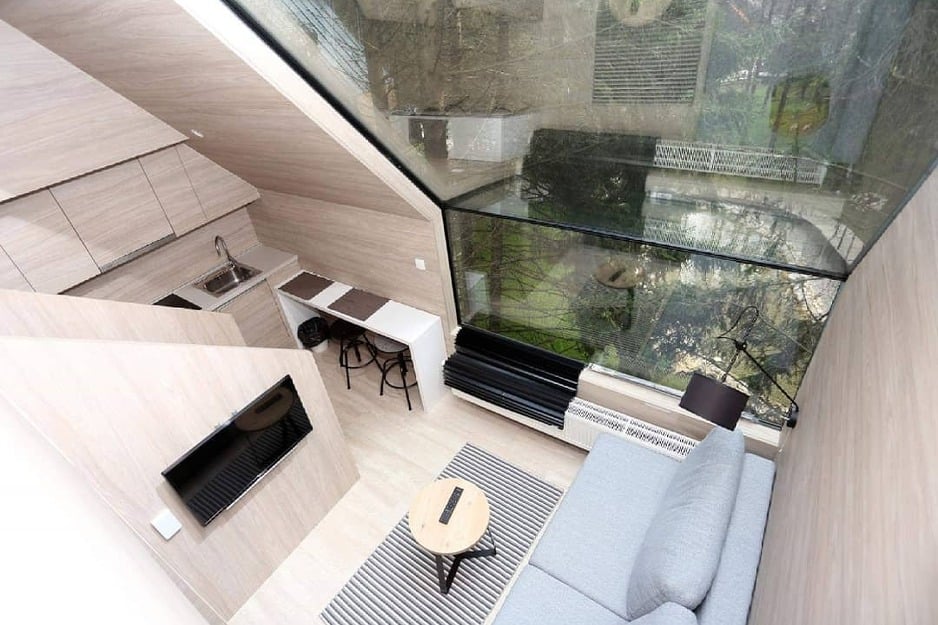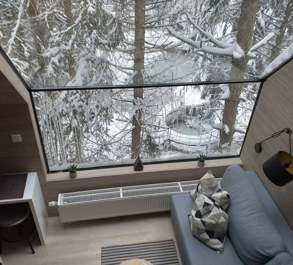 Особено пријатно е во куќичката на дрво кога низ големиот стаклен прозорец кој се протега дури до покривот, гледате како паѓа снег.